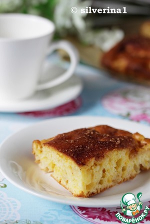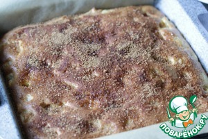 Готовый пирог вынуть из духовки и сразу же смазать растопленным сливочным маслом и посыпать коричневым сахаром, смешанным с корицей.
