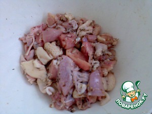 Нарезать на большие кусочки. Добавить соль, зиру, приправы. Оставить мариноваться 20-30 мин.