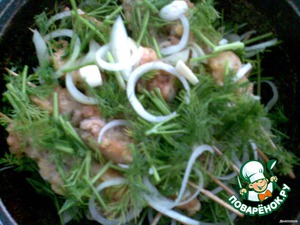 Затем в казан налить немного масла, добавить порезанный лук, шашлычки, порезанный укроп, чеснок и немного соли.