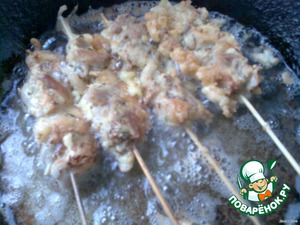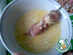 Добавить в яйцо муку и соль. Перемешать, затем обмакивать наши шашлычки.