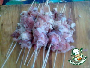 После этого нанизывать на деревянную шпажку по 4-5 кусочков.