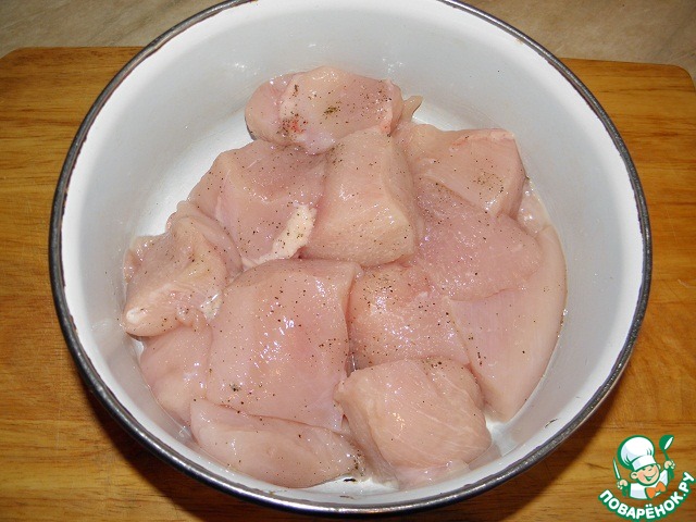 Бедра разрезаем на 3 части (у меня филе грудки, поэтому я разрезала просто на средние куски) солим, перчим