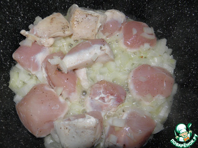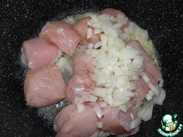 В кастрюле с толстым дном разогреваем сливочное масло, выкладываем курицу с луком