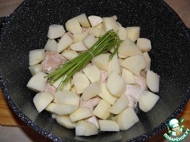 Добавляем к курице с луком картофель, кладем стебли укропа (петрушки)