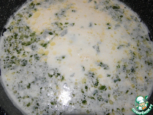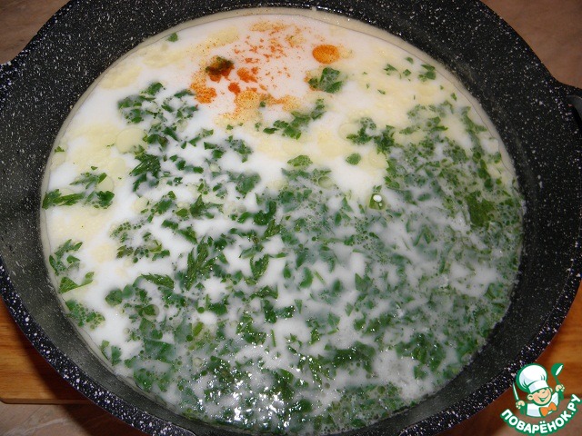 Когда мясо с картофелем практически готовы, удаляем стебли укропа (петрушки), добавляем листья зелени, вливаем сливки, добавляем паприку и специи по вкусу