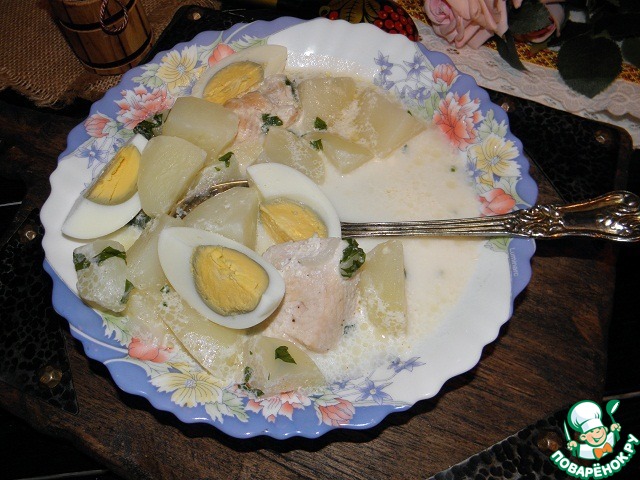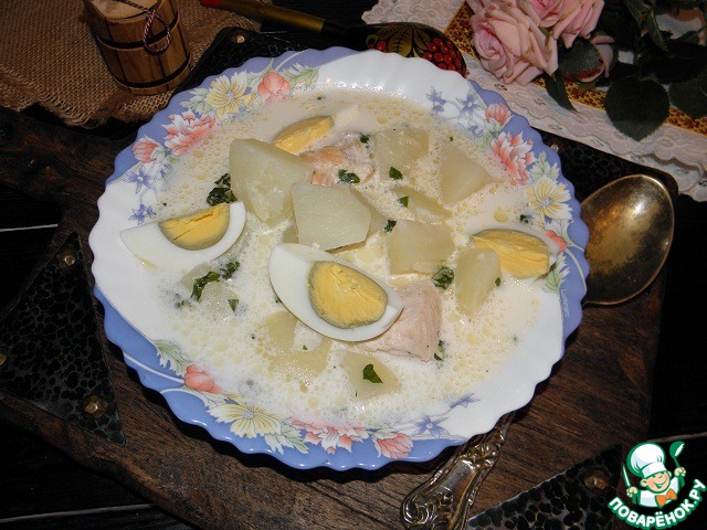 Яйца отварить вкрутую, нарезать кубиками, или разрезать пополам, разлейте суп по тарелкам, в каждую выложите яйца, приправьте перцем и подавайте.