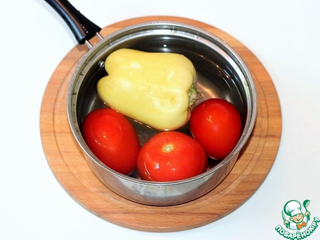 2. Помидоры заливаем кипятком и отставляем в сторону на 2-3 минуты.