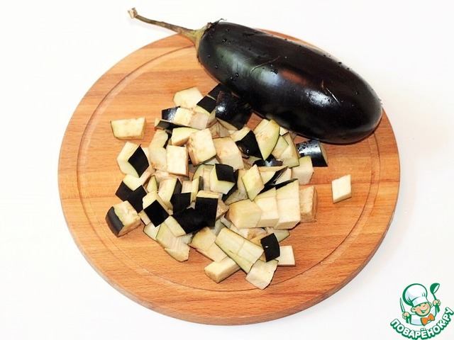 5. У баклажан, так же срезаем шкурку (по желанию) и нарезам кубиками.