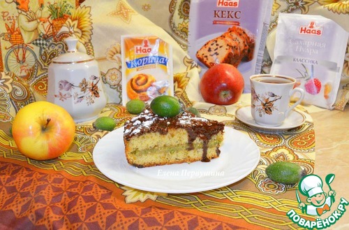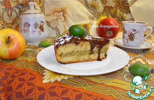 Очень вкусный кекс с дробленными фисташками, прослойкой из фейхоа, перетертой с сахаром, и коричной шоколадной глазурью с тертым яблоком. Очень интересный вкус и освежающий аромат.