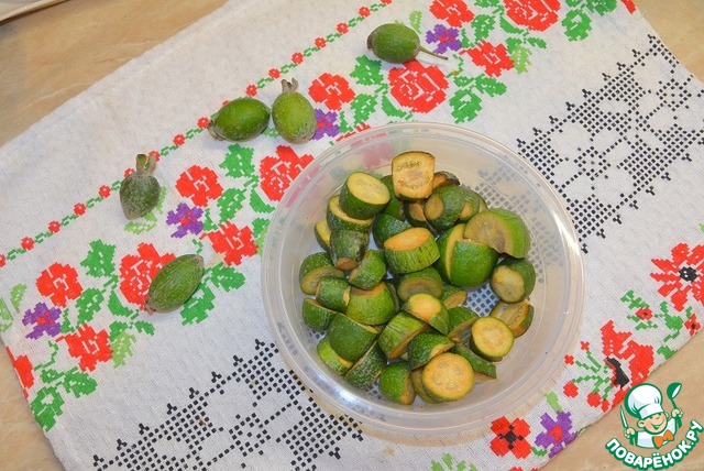 Фейхоа помыть, обрезать кончики и нарезать на 2-3 части.