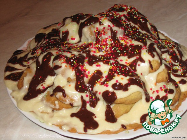 Песочное тесто, заварной крем и шоколадная помадка. А в целом очень нарядный и праздничный торт, хотя вполне можно его себе позволить в будни.