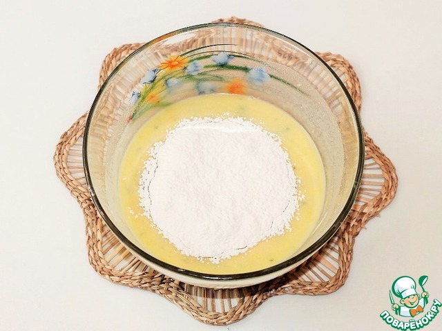 11. К жидкой смеси, частями добавить мучную, вначале перемешать ложкой и затем взбить миксером. Тесто должно быть без комков.