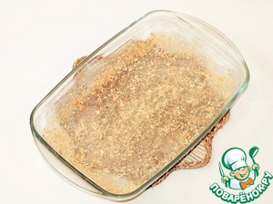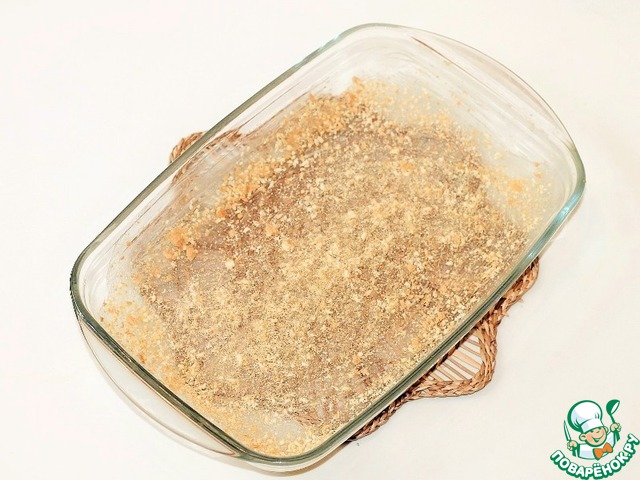 14. Форму для выпечки смазать сливочным маслом и обсыпать панировочными сухарями. У меня вместо сухарей печенье.