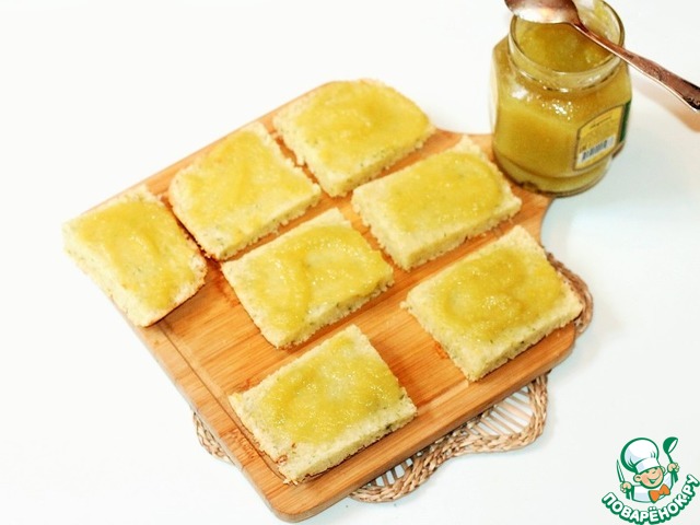 17. Полностью остывшие квадратики разрезаем на 2 части и смазываем джемом. Выкладываем пирожные на блюдо и посыпаем кокосовой стружкой.