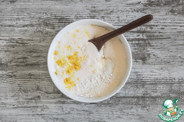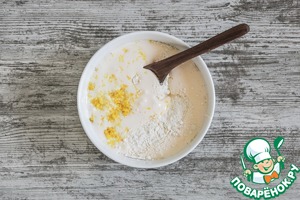 Взбейте яйца с сахаром добела, добавьте цедру, затем лимонный сок, смесь муки и крахмала.