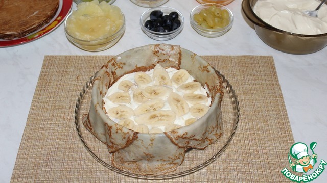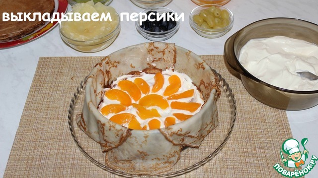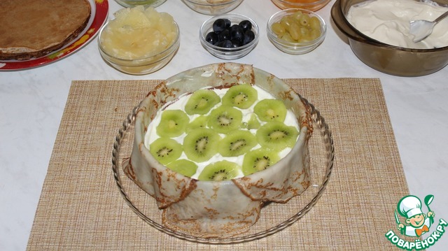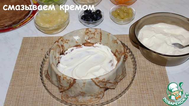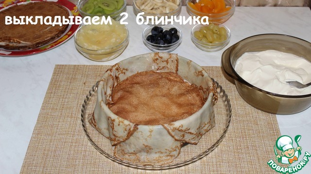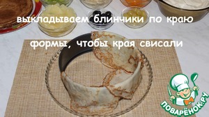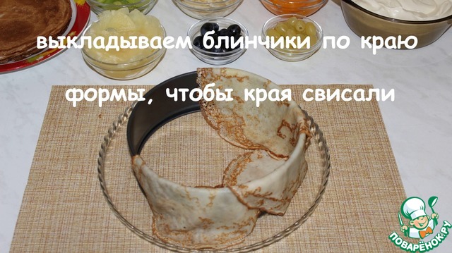 Выкладываем блинчики по краю формы, чтобы края свисали.