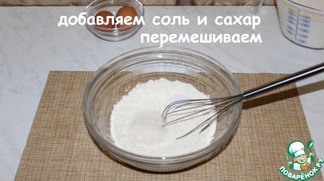 Готовим тесто для блинов. В просеянную муку добавляем соль и сахар, хорошо перемешиваем.