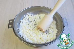 Творог (250 гр.) протереть через металлическое сито. Это нужно сделать обязательно! Творог должен иметь однородную структуру.