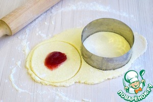 Тесто разделить на части, каждую часть раскатать в пласт толщиной 6-7 мм., выемкой для теста вырезать круг (d 10-12 см.). На середину круга добавить 1 ч. ложку джема, сверху края защипнуть.
