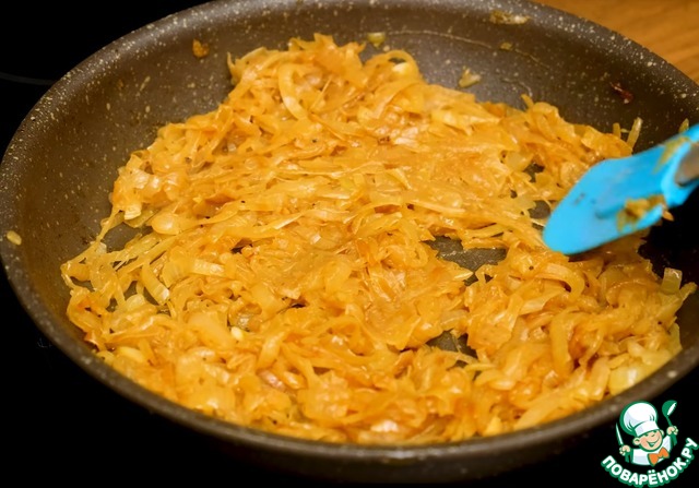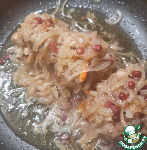 Лук нарезать полукольцами, обжарить до карамельного цвета (следите, чтобы не сгорел).