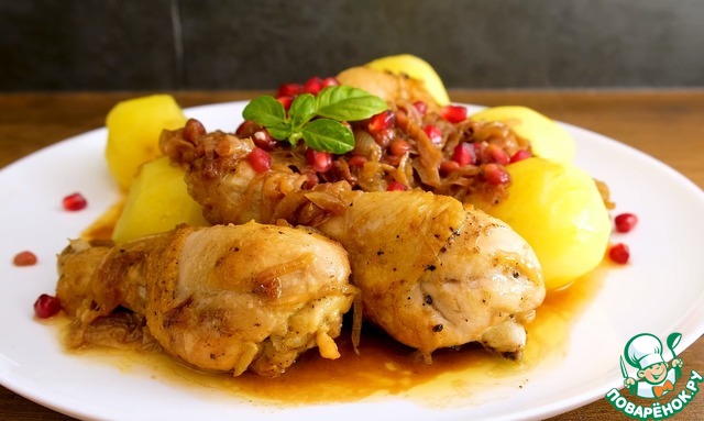 Хохоп - простое и быстрое горячее блюдо армянской кухни. Несмотря на свою простоту, выходит потрясающе вкусно: сочные куриные голени в сочетании с огромным количеством карамелизированного лука, легкой кислинкой от граната и нежностью сливочного масла. Как только я увидела этот рецепт, я уже не могла успокоиться, пока не приготовила. Подают это блюдо традиционно с отварным картофелем. При тушении получается очень вкусная подливка, которую можно вымакивать белым хлебом. Очень рекомендую приготовить в качестве быстрого ужина без заморочек, но также говорят, что это блюдо подают и на новогодние праздники, благодаря гранату оно действительно выглядит празднично.
