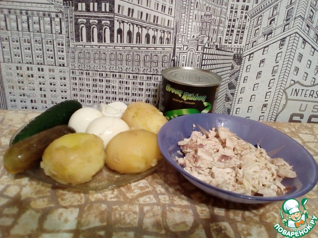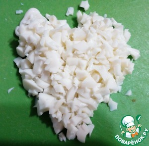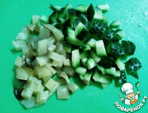 Отваренный в мундире и охлажденный картофель очистим и нарежем кубиками.