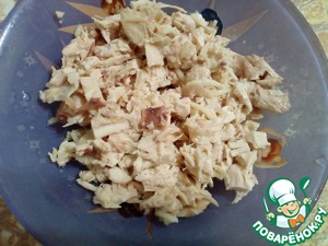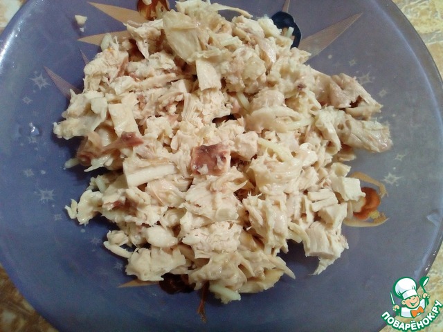 Нарежем отваренное куриное мясо (без кожи, лучше всего взять грудку)
