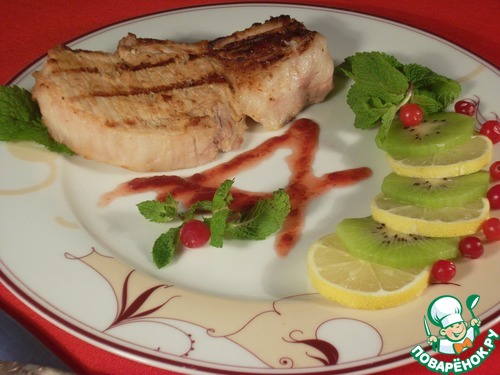 Свинину режем на антрекоты, промазываем маринадом и плотненько укладываем в подходящую посудину. Выдерживаем часа 2…2,5, не больше. Киви – такая штука, что не стоит передерживать…