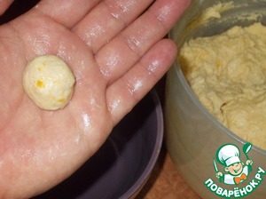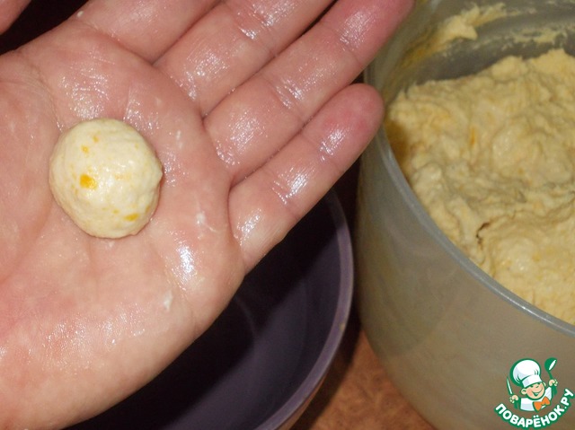 Когда вода уже почти закипела делаем вареники. Для формирования вареников смачиваем руки водой и отщипывая кусочки теста скатываем шарики.