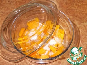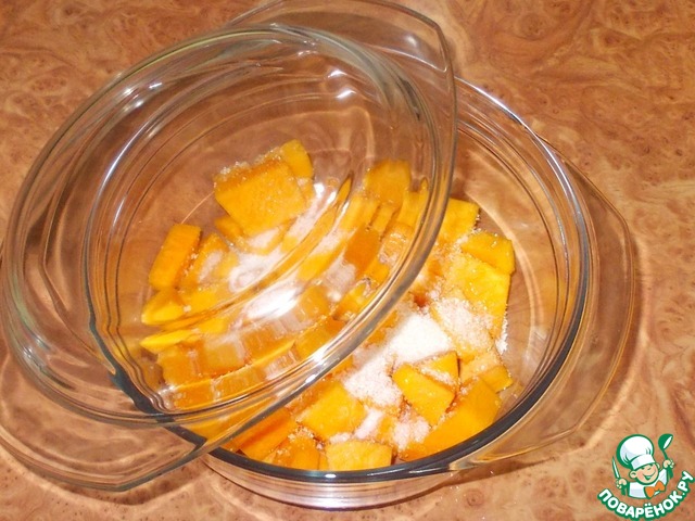 Тыкву нарезаем не крупным кубиком. Кладем в посуду пригодную для СВЧ. Посыпаем сахаром и солью. Накрываем крышкой и ставим в СВЧ на 5 минут при мощности 850.