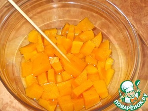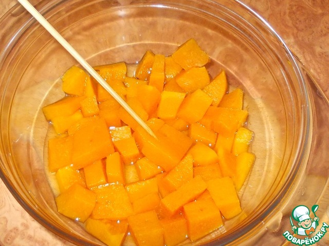 По истечении 5 минут проверяем тыкву на готовность деревянной шпажкой. Тыква должна быть полностью мягкая.