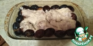 Присмотрелась, опять не нравится. Решила всю поверхность покрыть сливами. А на сливы выложила сметану, которая осталась после смазывания окорочков.