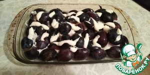 Куриные окорочка посолила, поперчила по вкусу, смазала сметаной с чесноком и уложила в форму для запекания. Но мне не очень-то понравилось, что по периметру формы есть свободные места. Решила положить туда свежие сливы. Предварительно разрезала их пополам и убрала косточки.