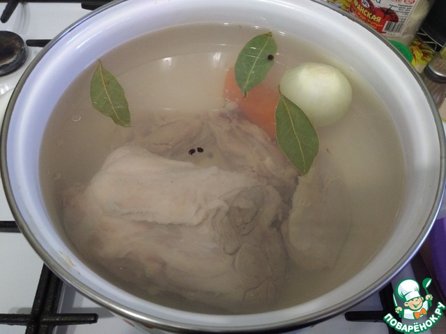 Первым делом ставим варить бульон. Кладем в воду свинину, курицу,1 морковь,1 луковицу, лавр и перец горошком. Варим 1,5 часа, не забываем убирать шум.
