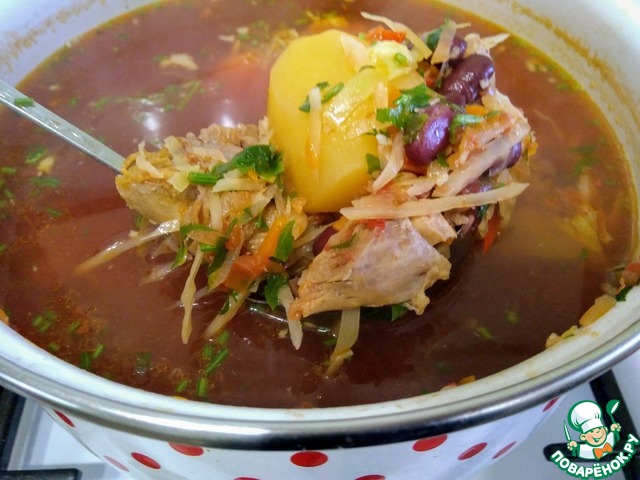 Как только сварился бульон, вынимаем лук, морковь, лавр, перец и мясо. Мясо отделить от кости и вернуть в бульон. Кладем картофель, следом через 10 минут капусту. Сварилось почти, кладем зажарку, солим, следом фасоль, зелень, выдавливаем чеснок и бросаем целый горький перец, выключаем!