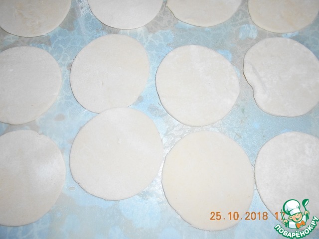 Раскатываем тесто, вырезаем кружки (не очень мелкие, а то будет трудно защипывать), выкладываем по 1ч. л. начинки.