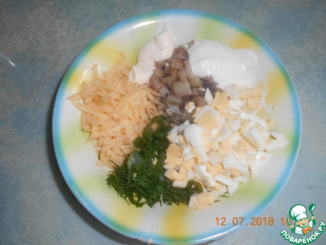 Селедку чистим от кожицы и костей, нарезаем кубиками. Яйца и зелень укропа, петрушки и лука нарезаем мелко, сыр на крупной терке. Добавляем майонез, все перемешиваем. Если селедка сильно соленая ее нужно будет вымочить в воде или молоке часа 3-4, меняя периодически воду.