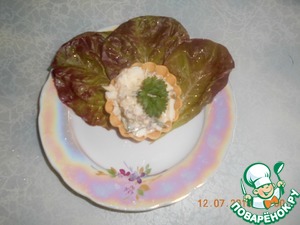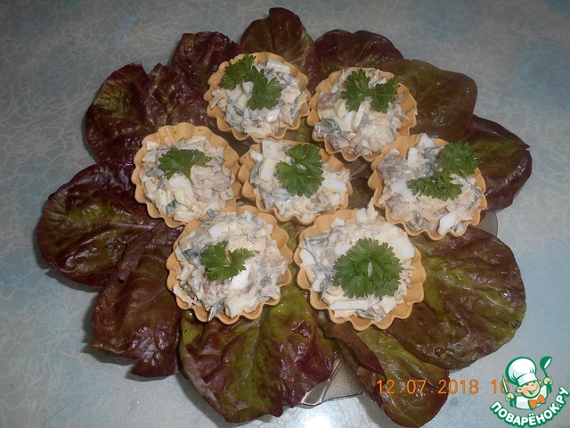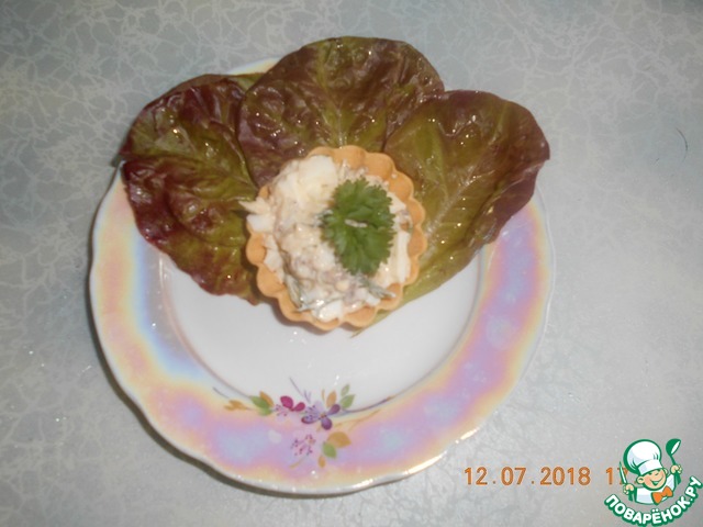 В тарталетки накладываем салат, украшаем листочками петрушки. На тарелку по кругу выкладываем листья салата, в середину ставим тарталетки.