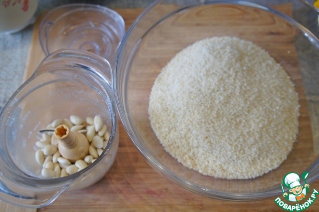 Миндаль надо подготовить заранее: сначала залить его кипятком на 4-5 минут, затем слить и хорошо обдать холодной водой. После этого очистить от шелухи и рассыпать на полотенце, чтобы он немного обсох. После этого порциями на тарелке подсушить в микроволновке 5-6 минут при средней мощности, перемешивая ядра через каждую минуту. Остудить.