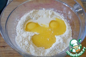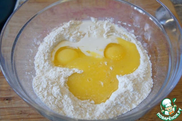 Затем добавить яйца, растопленное сливочное масло, молоко и замесить гладкое тесто.