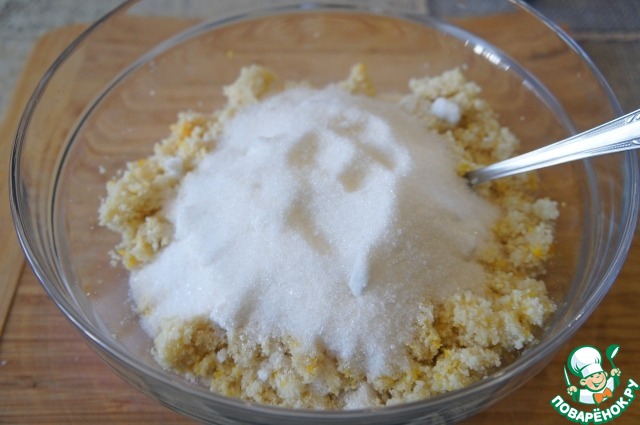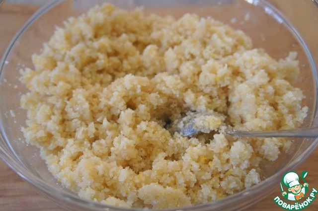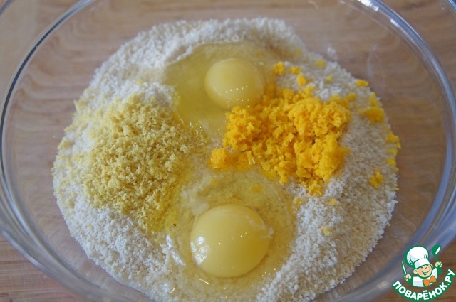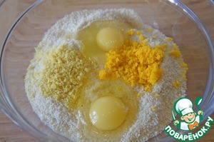 Займемся начинкой. К измельченному миндалю добавить оба вида цедры и яйца, перемешать.