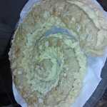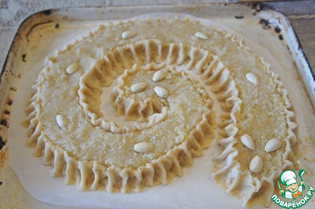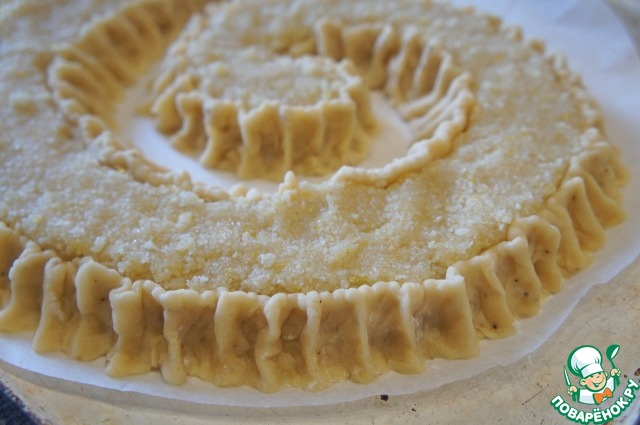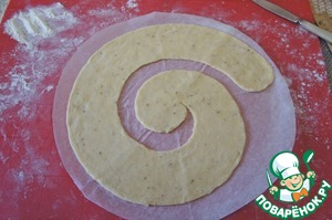Одну часть тонко раскатать на слегка посыпанной мукой поверхности и, накрутив на скалку, осторожно перенести на бумагу для выпечки. С помощью ножа для пиццы вырезать из теста спираль шириной около 7 см. Это оказалось самым трудным, при моих-то художественных способностях, когда и просто прямую линию на бумаге нарисовать для меня большая проблема:)
