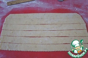 Оставшееся тесто также тонко раскатать и нарезать из него полоски шириной около 3-х см.