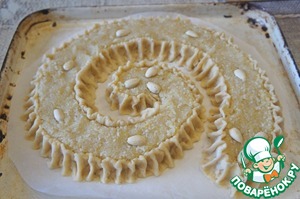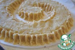Делая на полосках равномерные складки, украсить ими бока начинки, плотно прижимая к основанию теста. Начать лучше с внутренней части спирали.