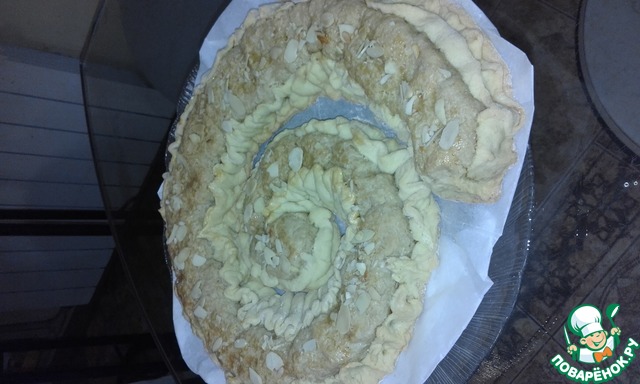 Выпекать в разогретой до 120*С духовке в течение 40-45 минут. Готовый торт должен лишь слегка зазолотиться, тесто должно подсохнуть, а начинка остаться сочной. Торт получился очень большим. Он не помещался ни на одно мое блюдо, даже самое большое. Пришлось выложить его на разделочную доску. Это было нелегко, торт очень тяжелый и форма у него необычная, любое неловкое движение и он мог сломаться. Мне помогал муж.