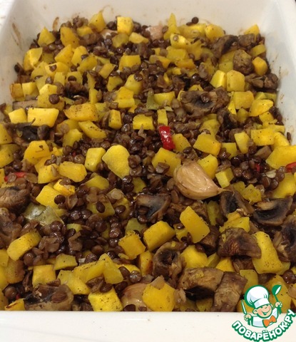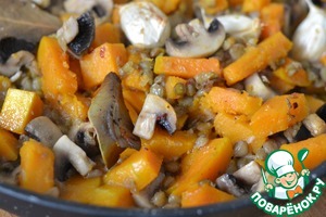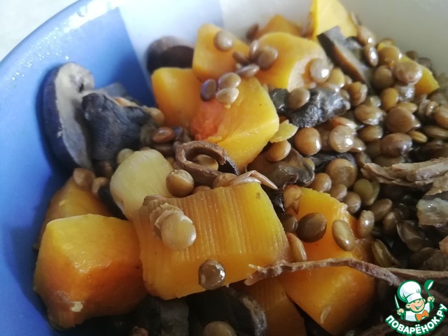 Добавить к тыкве чечевицу и шампиньоны. Аккуратно перемешать и допекать еще 20 минут.