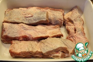 Рёбра желательно взять свежие, помясистей и не подвергавшиеся заморозке, но если таких нет, то сойдут любые. Промоем, обсушим, поместим в форму для запекания, желательно керамическую. -