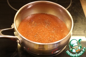 Готовим соус. Для этого в сотейнике соединяем томатную пасту, пиво, кетчуп (у меня домашний), мед и горчицу, вустерский соус (можно и без него). В соус выливаем бульон из мяса, который образовался после томления. Солим, перчим по вкусу. Увариваем соус на среднем огне 15 минут до загустения.