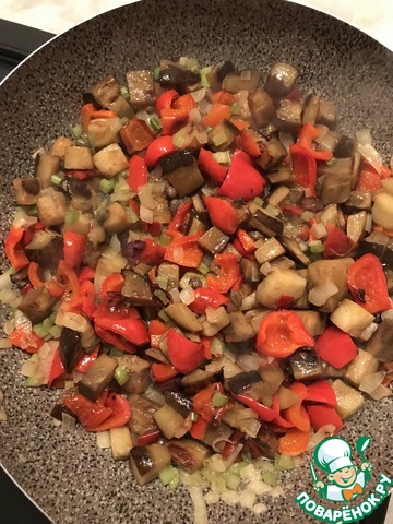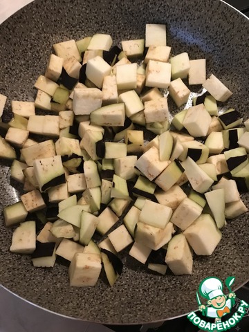 Почистить и нарезать кубиками баклажаны, поместить в дуршлаг. Лук нарезать жюльеном, перец кубиками, сельдерей кусочками. Обжарить баклажан во фритюре. Там же обжарить перец.