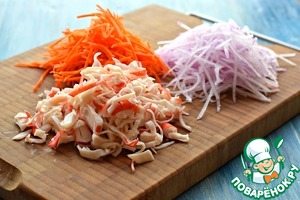 Крабовые палочки (или крабовое мясо) нарезать произвольно. -